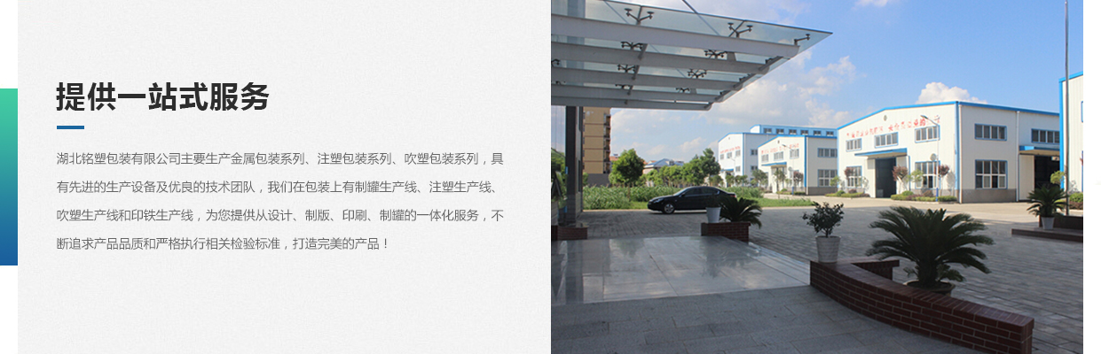 湖北銘塑包裝有限公司一家集研發(fā)、生產、銷售于一體的較優(yōu)秀民營企業,技術力量雄厚,產品質量可靠。位于交通暢順,百業興旺、經濟富裕、政策開放的孝感開發(fā)區域。我們企業的營銷戰(zhàn)略是以建筑為土壤,以產品為種子,以質量為肥料,讓綠色鋪滿全球。憑借多年來的行業經驗,公司不斷進行創新和研發(fā),為市場提供更廣泛的產品應用領域和更好環(huán)保節(jié)能產品,為國家能源環(huán)保戰(zhàn)略和可持續(xù)發(fā)展戰(zhàn)略作出應有的貢獻。 湖北銘塑包裝有限公司主要生產金屬包裝系列、注塑包裝系列、吹塑包裝系列,具有先進的生產設備及優(yōu)良的技術團隊,我們在包裝上有制罐生產線、注塑生產線、吹塑生產線和印鐵生產線,為您提供從設計、制版、印刷、制罐的一體化服務,不斷追求產品品質和嚴格執(zhí)行相關檢驗標準,打造更好的產品!